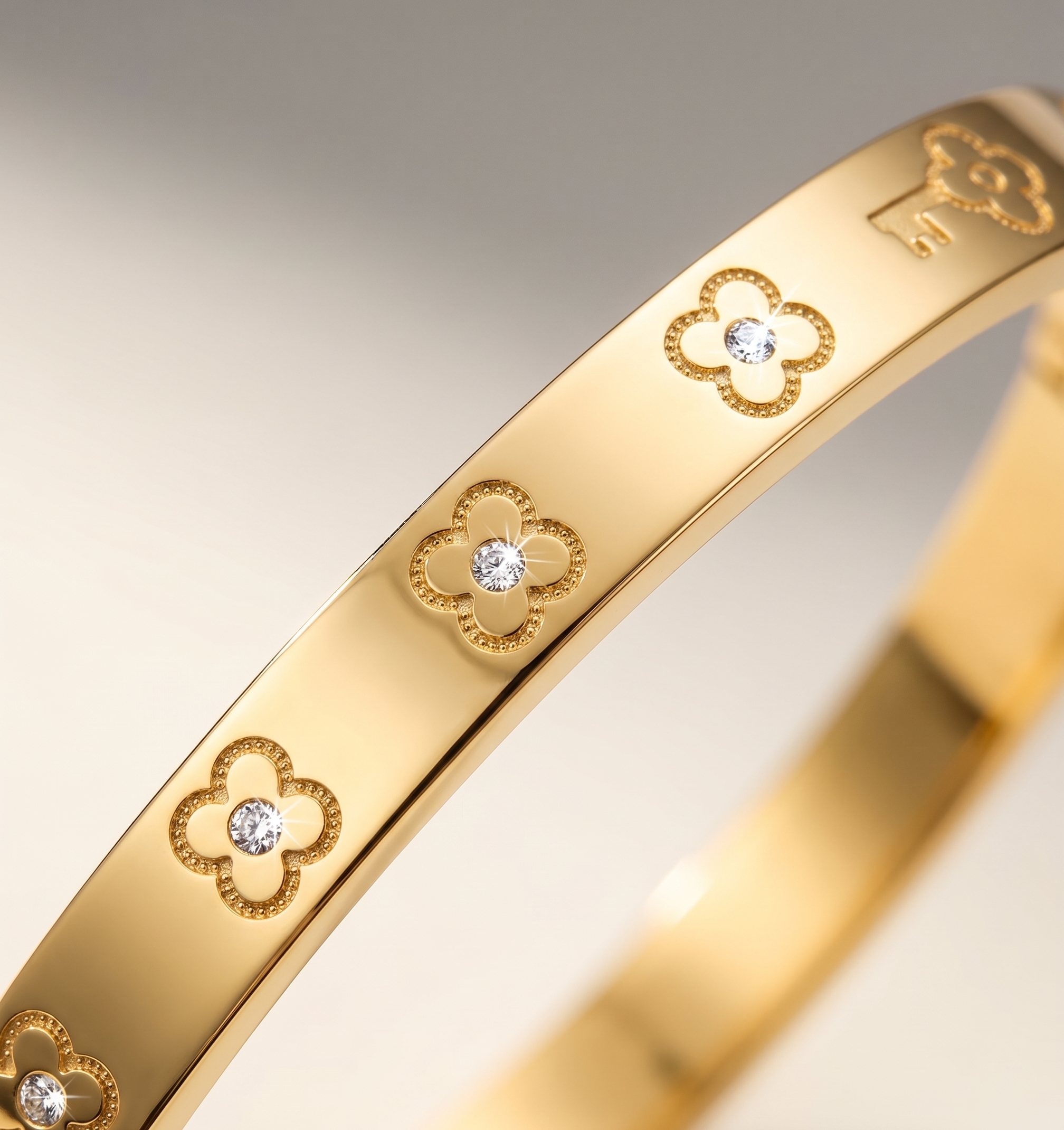 Bracciale rigido in pregiato metallo dorato con finitura Gold Filled e iconiche incisioni a quadrifoglio. L'eccellenza e il lusso minimalista in un solo accessorio.