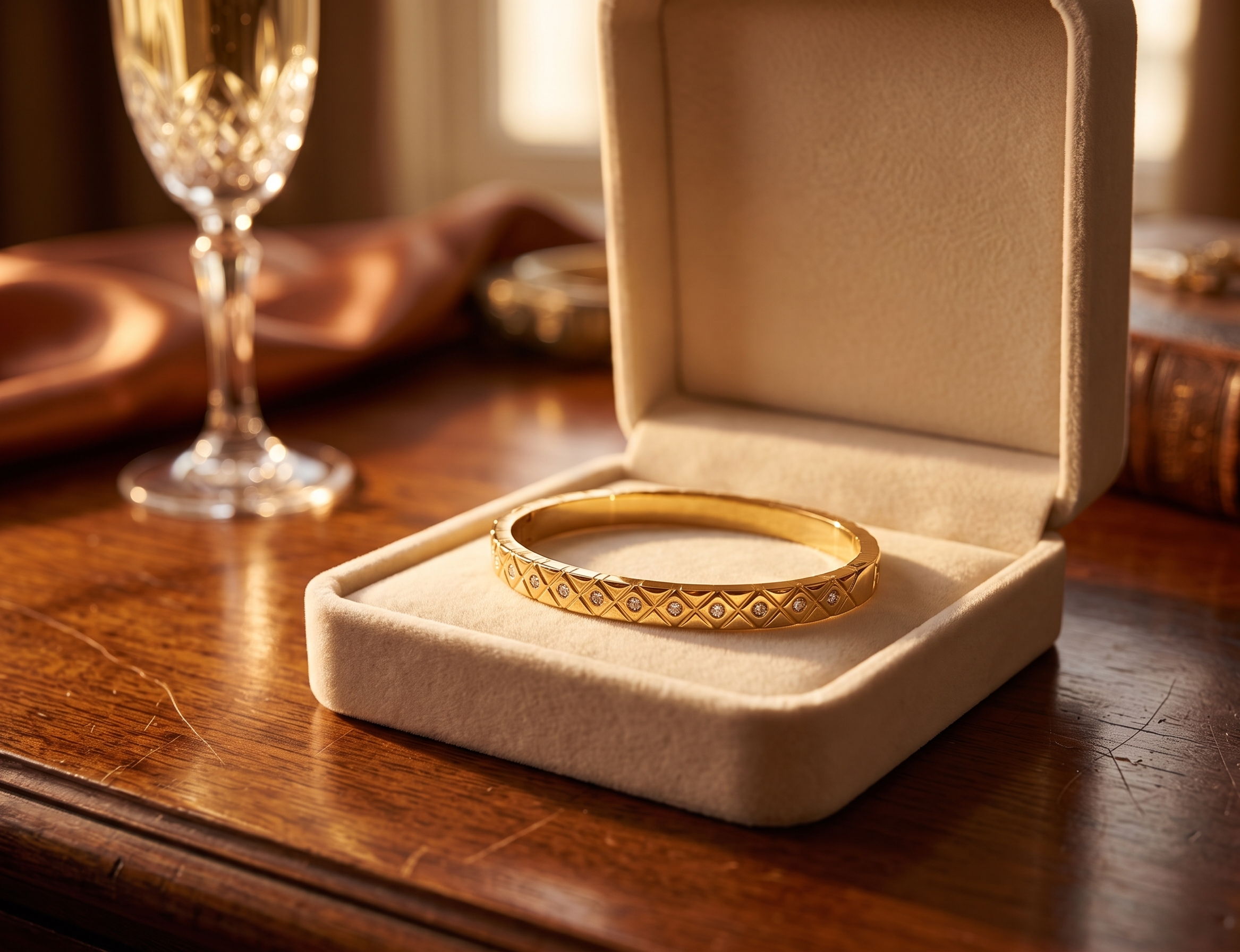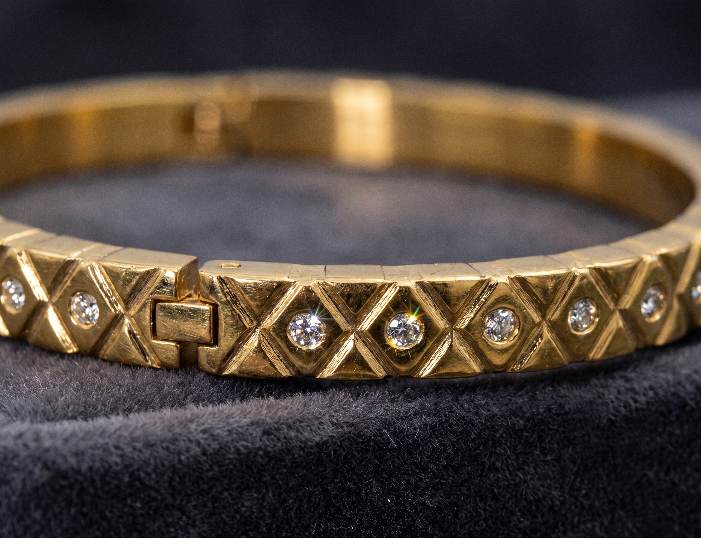 Bracciale rigido dorato impreziosito da un delicato motivo geometrico e punti luce incastonati a mano. L'accessorio perfetto per l'ufficio e per la sera.