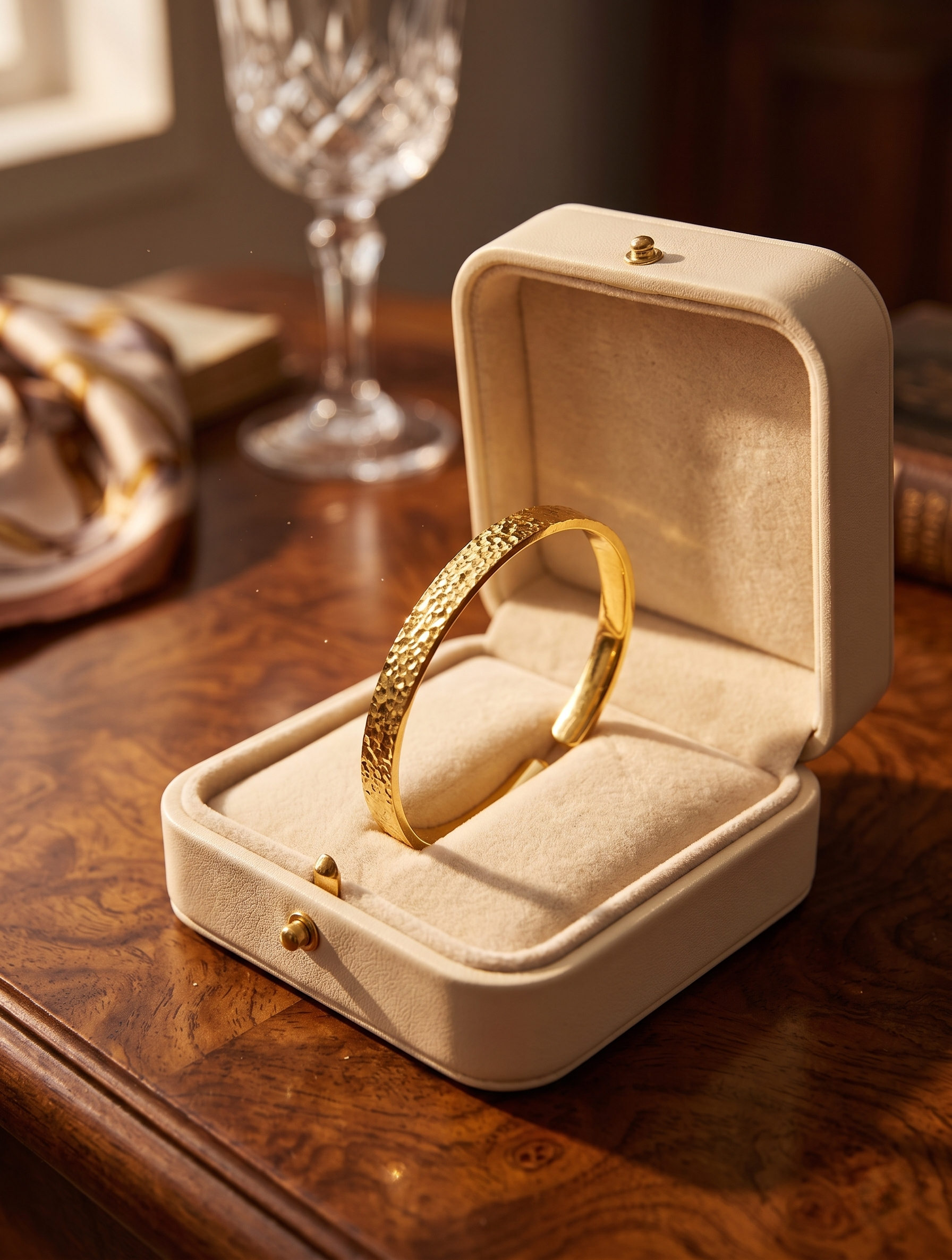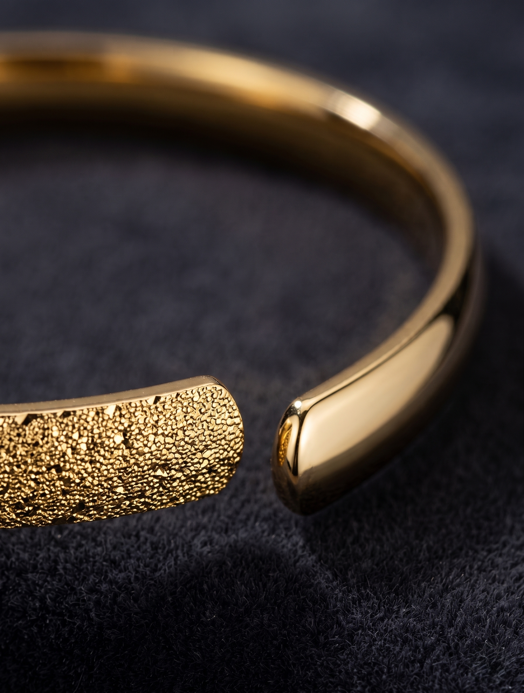 Un gioiello scultoreo a fascia aperta. Il finish martellato a mano crea riflessi ineguagliabili catturando la luce da ogni angolazione. L'apice dell'artigianato.